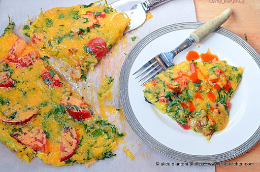 In a non-stick skillet (about 7-8″ diameter) put the oil; turn heat to medium. Add the broccoli slaw and saute/cook for about 3 minutes. Pour the egg mixture over the broccoli. Add the tomatoes on top; do the same with the parsley/cilantro, chives and cheese.