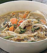 3.Stir in the remaining 5 cups broth, the rice mix and bring to a boil, lower the heat and simmer, stirring occasionally, until the rice is tender about 25 minutes. Season with salt and pepper and simmer for about 5 minutes.