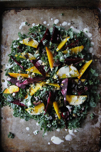 Arrange 4 cups of finely shredded curly kale, and then slice the beets up to cover the salad. Add the pistachios and crumble the bacon over everything.