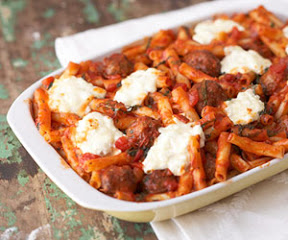 1. Cook pasta according to package directions; drain. Return to pan. Stir in pasta sauce, meatballs, and tomato sauce. Transfer to an ungreased 13x9x2-inch glass baking dish or 3-quart rectangular casserole. Bake, covered, in a 350 degrees F oven for 30 minutes.