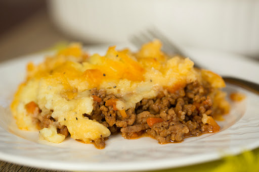 4. Transfer the meat mixture to a 1½-quart casserole dish. Cover with the mashed potatoes. Brush the top of the mashed potatoes with the melted butter. Bake for 50 minutes, or until evenly browned on top. Leftovers can be stored in the refrigerator for up to 4 days.