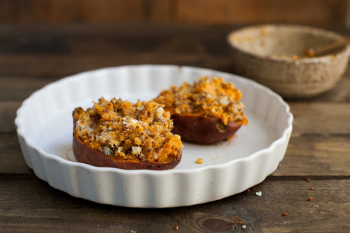Twice Baked Blue Cheese and Quinoa Sweet Potato with Maple-Mustard Arugula Salad