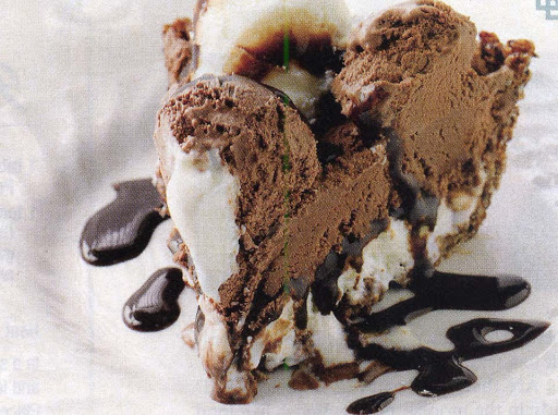 Top with alternating scoops of vanilla and chocolate ice cream. Cover and return to the freezer until serving time. Drizzle with additional syrup just before serving. Makes 8 servings.