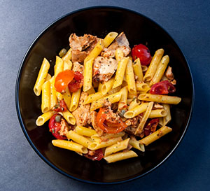 - Fire-roasted tomatoes give this pasta entree a smoky flavor.