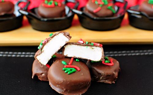 Melt chocolate according to package instructions. Slice logs (one at a time, leaving the rest in the freezer until ready to use) into 1/4" patties. Dip into chocolate and lay on a wax paper lined cookie sheet. Be sure to dip quickly so the patty doesn't get too soft.