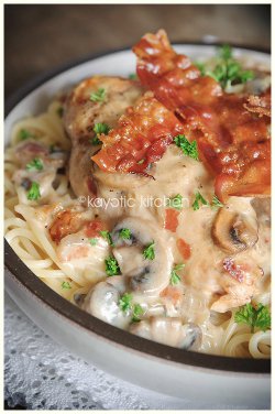 Gives you 25 minutes to cook the spaghetti according to the directions on your package. Now that’s doable. Garnish with more bacon and parsley.