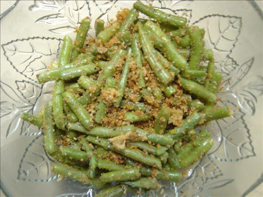 1 Wash and trim fresh string beans. 2 Add string beans to a pot of boiling water. 3 Cook until soft and drain water. 4 In large frying pan, heat butter and olive oil over medium heat and add minced garlic. 5 Let garlic sautee in butter and oil until a light golden brown and add string beans. 6 Stir, coating all the string beans with butter and oil. 7 Sprinkle string beans with bread crumbs and stir, coating all of the string beans. 8 (If it's a little dry add some more oil) Sprinkle with parmesan cheese, oregano, salt and pepper. 9 Serve immediately.