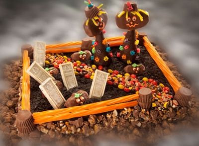 6. Position and push scarecrows, pumpkins and tombstones into "dirt" frosting. Unwrap and coarsely chop TAKE FIVE Bars; push into sides of frosted brownie. Unwrap and coarsely chop peanut butter cups; place around base of brownie.