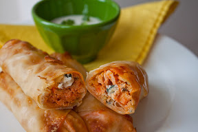 Preheat oven to 400 degrees F. Lay egg roll wrappers on a clean work surface. In a small bowl, stir chicken* (see note below) and hot sauce until well coated, using more or less sauce depending on your spice preference. The meat should be moist with sauce.