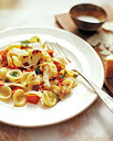 Orecchiette are adept at catching the small bits of sweet potato and bacon in this dish, but any shell pasta will work.