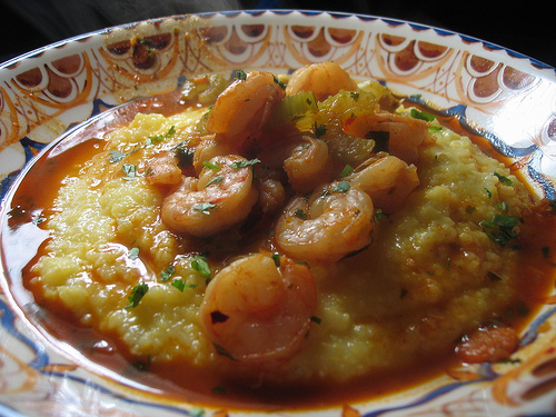 Serve the shrimp and mushroom sauce alongside the baked grits.