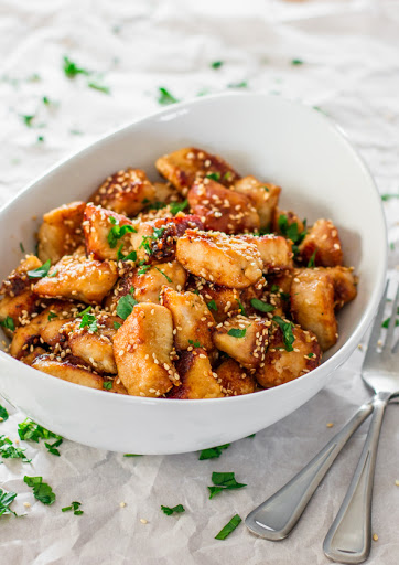 Pour the sauce over the chicken in the skillet and sprinkle sesame seeds over and stir.