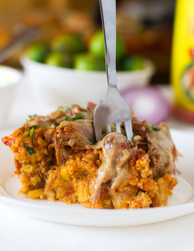 Preheat oven to 400 degrees. Whisk the cornmeal, flour, salt, baking powder, and sugar. Stir in the oil until the mixture makes soft crumbs. Whisk in the milk and egg. Add the cream corn and green chiles and stir until just combined. Bake in a 9-inch square pan (or larger, depending on how thick you want it) for 25 minutes or until set. Since it’s a tamale-like base, it won’t be completely dry like a cornbread. It’s supposed to be just a little mushy.
