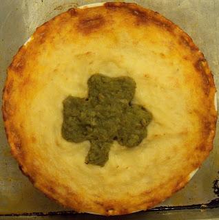If you like, mash up about 1/2 (14.5 oz) can of green beans and, using a cookie cutter (I used a shamrock shape for St. Patrick's Day) fill with the mashed beans. Be sure to place the cookie cutter in the meat mixture before adding the potato mixture around the cookie cutter.