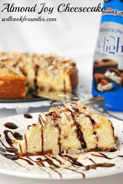 Mix coconut flakes with sweet condensed milk. Spread the coconut over the cheesecake. Spread the almonds over the coconut. Bake fore another 10-13 minutes.