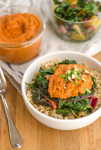 Brown Rice Bowl with Chard & Nutty Tomato Romesco Sauce
