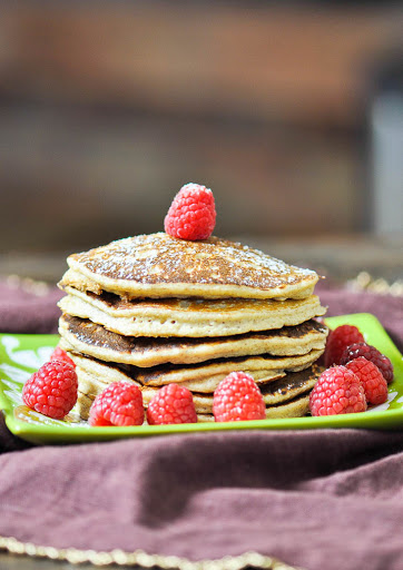 Heat a large non-stick skillet and spray with non-stick cooking spray, or use a non stick pan. For each pancake pour ¼ cup of the batter, I made 3 pancakes at a time in my large skillet. Flip when they start to bubble and cook until golden brown.