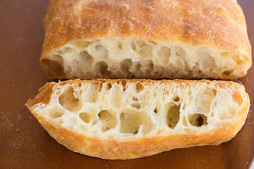 8. Slide the parchment pieces with the loaves onto a pizza peel. Using floured fingertips, evenly poke the entire surface of each loaf to form a 10x6-inch rectangle; spray the loaves lightly with water. Slides the loaves and parchment onto the baking stone. Bake, spraying the loaves with water twice more during the first 5 minutes of baking time, until the crust is deep golden brown and the loaves register 210 degrees F, 22 to 27 minutes.