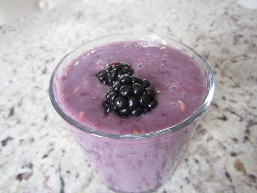 This smoothie is best enjoyed without a straw, as pomegranate arils tend to get caught up in average size straws. Adding a few blackberries as a garnish only improves the experience of gobbling this up straight from your cup.