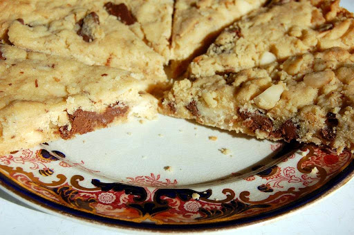 A couple of weekends ago we watched an episode of Diary of a Foodie: Hawaii’s Big Island. The Gourmet test kitchen made these cookies. They really looked good. I bought the ingredients I needed and made them today. They are really easy to put together. Instead of one large circle I put them in 2 8" round cake pans. The next day these are better than the first day. When I make them again I would add more chocolate chunks.