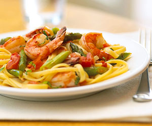An easy, tasty, low-fat meal. As the pasta cooks, the asparagus and shrimp sizzle in a skillet.