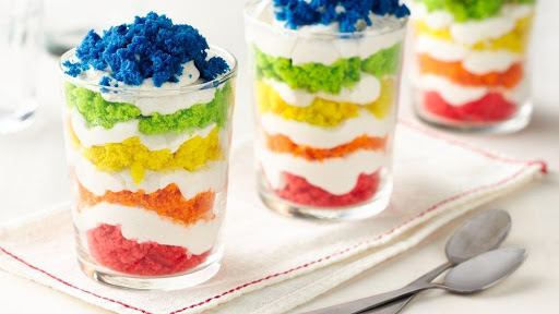 5 Crumble each of the cupcakes, keeping the colors separate. Sprinkle red cake crumbles into each of 12 glass parfait cups, glasses or small jars. Pipe whipped cream on top of each. Repeat process with orange, yellow, green and blue cake crumbles, finishing with the blue cake crumbles. Serve immediately, or refrigerate until ready to serve.