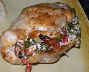 Mix the rest of the ingredients together, (add salt and pepper here too). Spread a thick layer over chicken. Pulls ends of chicken together and secure with twine or toothpicks to seal in the stuffing.