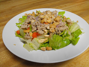 Spoon the chicken mixture, evenly divided, into the lettuce leaves. Set on a serving dish. Top with green onion and cucumber. Serve immediately.