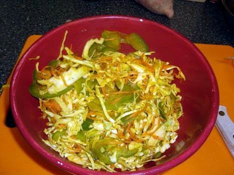 Meanwhile, toss the cabbage, cucumber and bell pepper together in a serving bowl.