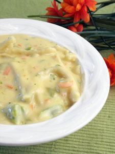 Add the milk a little at a time, stirring after each addition. Defrost and drain the broccoli if using frozen broccoli. Chop the broccoli into pieces as desired. Add the broccoli to the milk mixture in the saucepan. If you are adding homemade noodles, do so now.