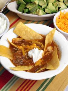 To serve, garnish the soup with shredded cheese, sour cream, onions, and salsa.