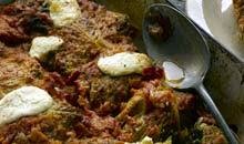 Preheat the oven to 180C/350F/ gas mark 4. If the stems of the cabbage leaves are thick, pare them down a bit with a vegetable peeler. Blanch in boiling, lightly salted water for three minutes, refresh and pat dry.