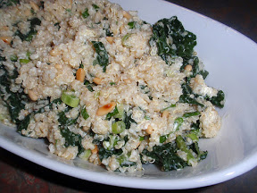 3. Check the quinoa and kale - the water should have absorbed, and the quinoa will be tender but firm, and the kale tender and bright green. If the quinoa still has a hard white center, you can steam it a bit longer, adding more water if needed. When the quinoa and kale are done, fluff the pilaf and tip it into the waiting bowl with the remaining ingredients. As the hot quinoa hits the scallions and lemons, it should smell lovely. Toss to combine, seasoning with salt and pepper and the remaining lemon juice if needed.