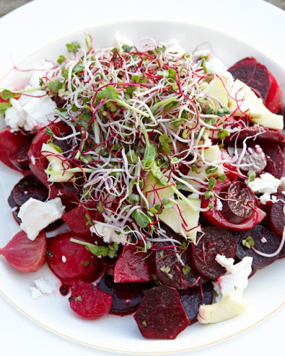 Toss arugula, chopped apple and pickled beets in vinaigrette. Place in bowl and garnish with nuts, pieces of chevre cheese, and fresh dill.