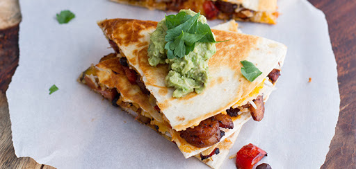 To assemble and cook the quesadillas, heat an electric griddle or skillet over medium heat. Add a bit of olive oil. Lay a tortilla flat on a cutting board and cover one half of the tortilla with a bit of the cheese, then evenly distribute the rice and beans on top. Add the red peppers, shrimp and sausage. Then add the pickled jalapeños and sprinkle with a little more cheese. Fold the empty half of the tortilla over the filling. Repeat with the remaining tortillas. Working with one or two at a time, place the quesadillas in the skillet and cook until the bottom is crispy and golden brown, then gently flip and cook for another 2-3 minutes until crispy and golden. Repeat with the remaining quesadillas. Serve with guacamole and fresh cilantro or parsley.