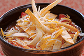 LADLE soup into serving bowls; top with cheese and tortilla strips.