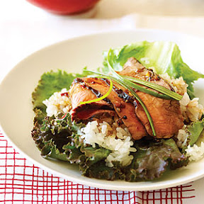 4. Spoon about 1/4 cup rice onto middle of each lettuce leaf. Top with a little steak, a scant tsp. sauce, and onion strips.