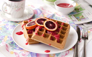 Drizzle blood orange sauce. Serve warm with maple syrup and powdered sugar.