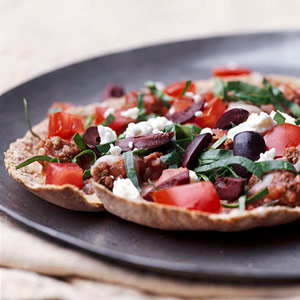 Top toasted pita bread with meat mixture; sprinkle with mozzarella cheese. Bake for 2 to 3 minutes more or until cheese is melted. Remove from oven. Top with spinach, tomato, feta cheese, and olives; serve immediately. Makes 4 servings.
