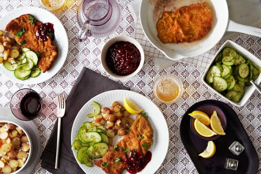 A well-made schnitzel requires nothing but lemon—though lingonberry preserves and potato and cucumber salads make nice accompaniments, too. The size of your schnitzel is limited only by the capacity of the pan in which you cook it: The cutlet must fit inside comfortably and lie flat. A high-sided 10- or 12-inch sauté pan is ideal. To achieve a consistent golden-brown color, replace the fat after frying each cutlet. For maximum crispness, replace the bread crumbs with panko—not the traditional choice, but an acceptable tweak in this crunch-loving author's opinion.