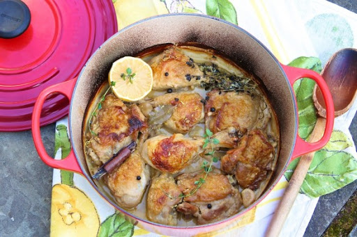 Put the chicken back in the pot with the rest of the ingredients, and cook in the preheated oven for 1 hour and 30 minutes. (I don’t baste or even peek, although I have taken the chicken out after 1 hour and 20 minutes and it was fine. I have also cooked early and reheated.) The lemon juice will sort of curdle the milk, making a thick sauce, which is creamy and absolutely delicious.