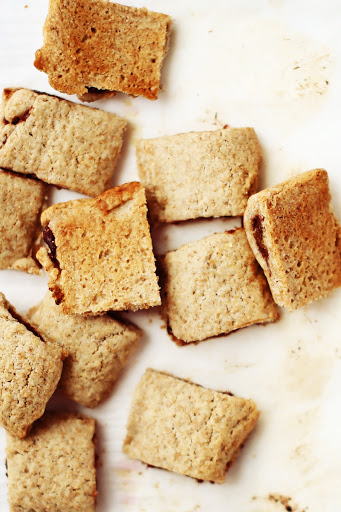 Use a small spoon to divide the filling along the inner edge of each of the long strips of dough, leaving about a ¼” inside border (as pictured). Use a floured bench scraper or metal spatula to fold dough over filling. If filling is too soft to handle, put it in the fridge for a minute to firm up (but not too long or it’ll be too stiff to fold and start to crack – if this happens just let it sit at room temperature for a few minutes then try again. Even if it cracks, it’s ok. Repeat with second half of dough. Slice evenly crosswise to make a double strip of bars (the two batches yield grand total 32 bars).