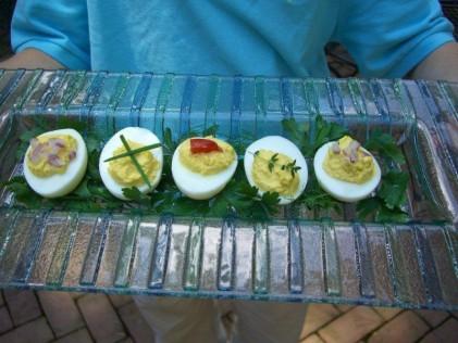 Spoon the yolk mixture into the hollows of the egg whites and place them on a serving plate. For a fancier look, spoon the egg yolk mixture into a resealable plastic bag, snip off the corner, and pipe the mixture into the hollows of the egg whites. Sprinkle the tops with chopped herbs or other garnishes.