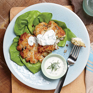 3. To prepare dressing, combine buttermilk and next 4 ingredients (through garlic), stirring with a whisk. Stir in 1 1/2 teaspoons chives, 3/4 teaspoon parsley, and 1/2 teaspoon dill. Arrange lettuce leaves on a platter; top with crab cakes. Spoon dressing over crab cakes; sprinkle with remaining 1 1/2 teaspoons chives, remaining 3/4 teaspoon parsley, and remaining 1/2 teaspoon dill.