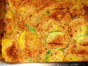 2. In a saucepan, melt 2 tbsp butter, sour cream, cheese, salt and paprika until smooth. A tbsp at a time, whisk the cheese sauce into the eggs so that they become tempered and don't cook upon contact. Put all the squash in a 9x13 casserole dish. Cover with cheese sauce.