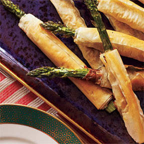 2. Wrap 1 prosciutto strip around each asparagus spear, barber polestyle. Place 1 phyllo sheet on a work surface (cover remaining phyllo to prevent drying); coat phyllo with cooking spray. Cut crosswise into thirds to form 3 (4 1/2 x 9inch) rectangles. Arrange 1 asparagus spear across 1 short end of each rectangle; roll up jelly-roll fashion. Arrange rolls on a baking sheet; coat rolls with cooking spray. Repeat procedure with remaining phyllo, asparagus, and cooking spray. Bake at 450° for 10 minutes or until phyllo is golden and crisp. Serve warm or at room temperature.