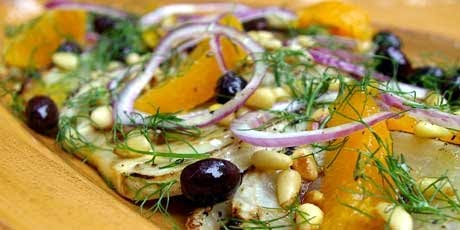 3. Slice the onion into paperthin rings and arrange over the salad. Scatter over the olives and pine nuts. Squeeze over lemon juice to taste. Drizzle over a little more olive oil. Finally, scatter over the reserved fennel fronds. Serve.