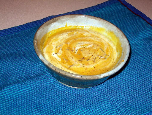 Mix the carrots into the pot. Pour in vegetable stock and dried mushrooms, and season with salt, bayleaf, pepper, seaweed and thyme. Bring to a boil, reduce heat, and simmer until vegetables are tender. Add squash. In a blender or food processor, puree the soup mixture until smooth. Add a spoonful of half and half or yogurt to each serving bowl and swirl. Serve warm with a dash of nutmeg and garnished with a sprig of rosemary.