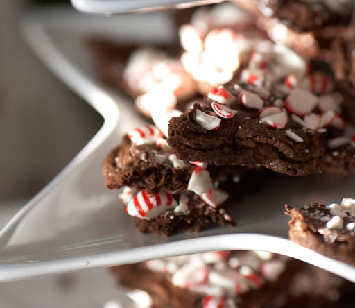 Bake one sheet at a time until the top looks dull, not shiny, and feels evenly firm at the edges and center, about 14 to 16 minutes. As soon as each baking sheet comes out of the oven, sprinkle half of the chocolate chips over each cookie slab. Let the chocolate chips sit for 5 minutes, to soften and melt. Use a small metal spatula to spread the melted chocolate over the cookie, covering most of the cookie. While the chocolate is still warm, sprinkle half the peppermint candy evenly over the slab.