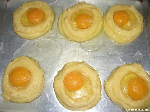 Hervir la espinaca. Hacer un puré de papas (después de hervirlas con cáscara), manteca, 3 yemas, queso rallado, sal, pimienta y nuez moscada.